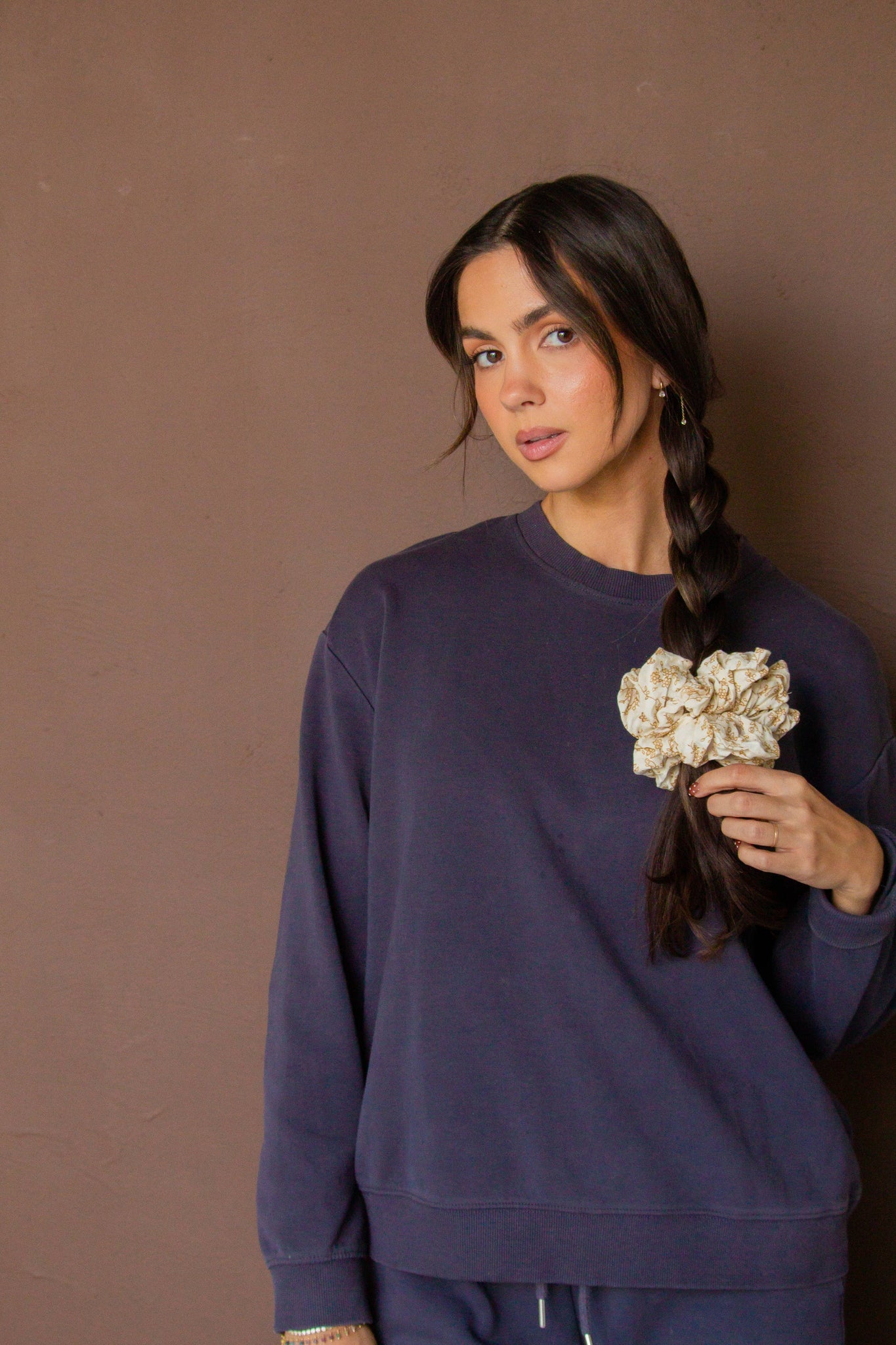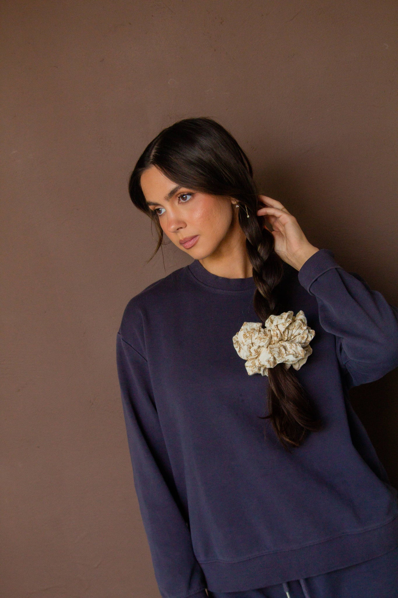 This jumbo scrunchie is the perfect addition to your fall accessories. It is made in a nice lightly textured fabric, and is the cutest cream & tan floral combo. It'll be the perfect addition to your hairstyles this fall.