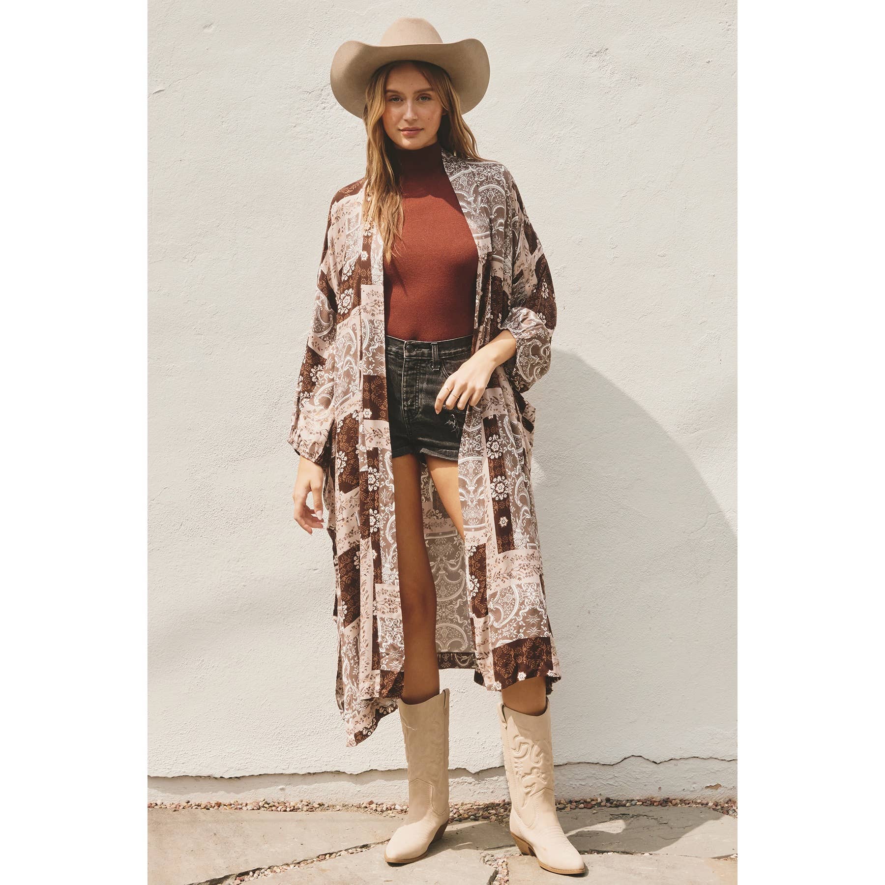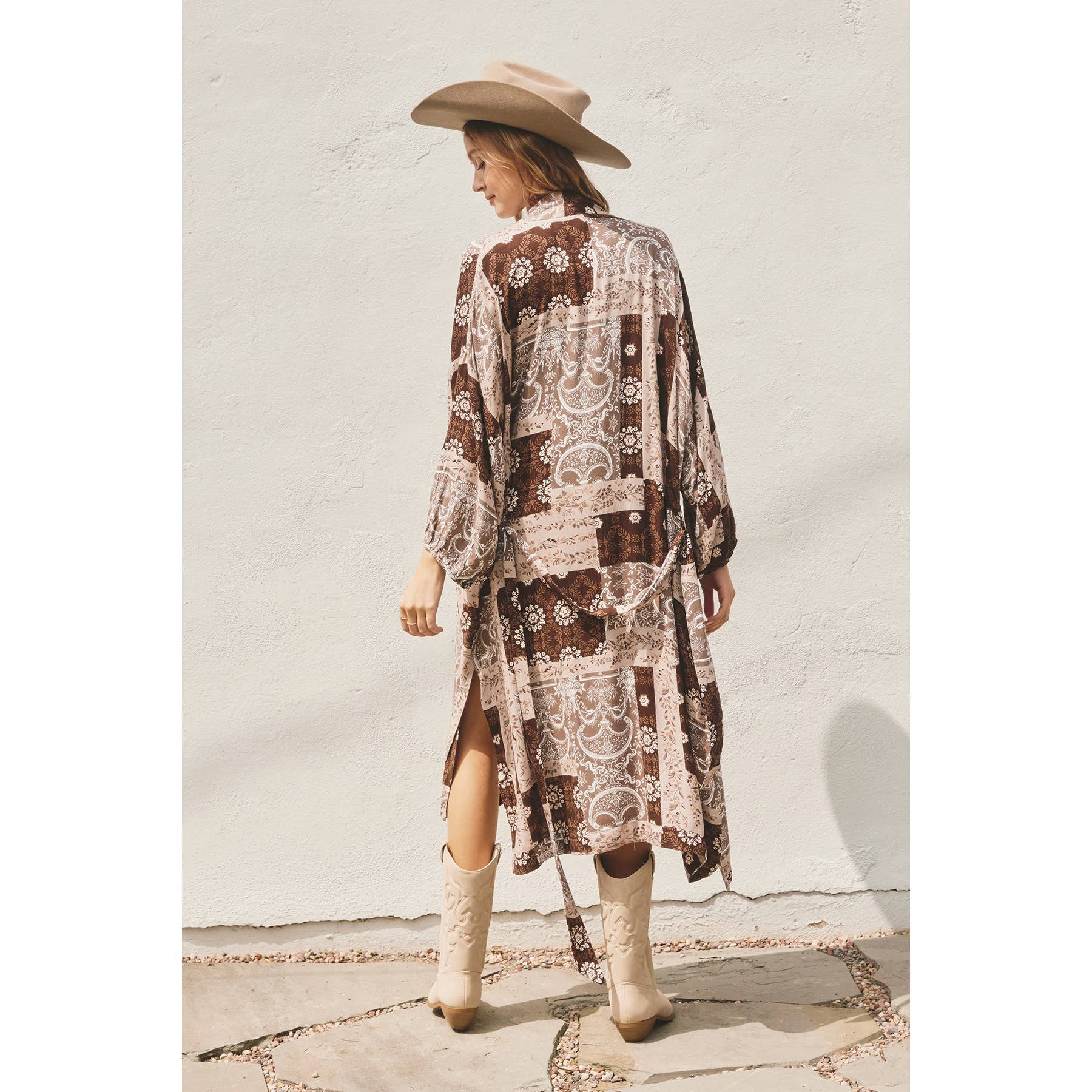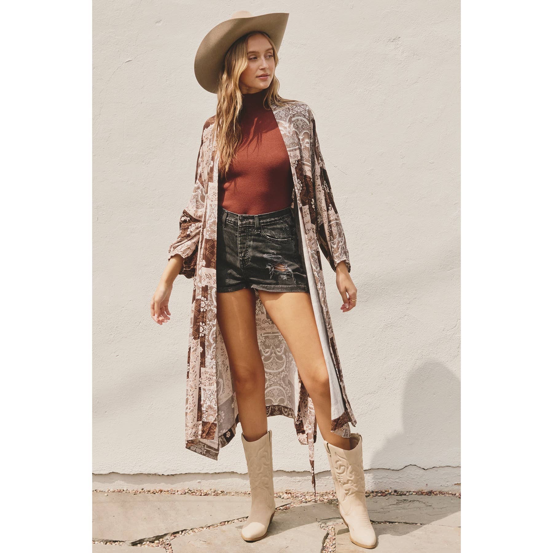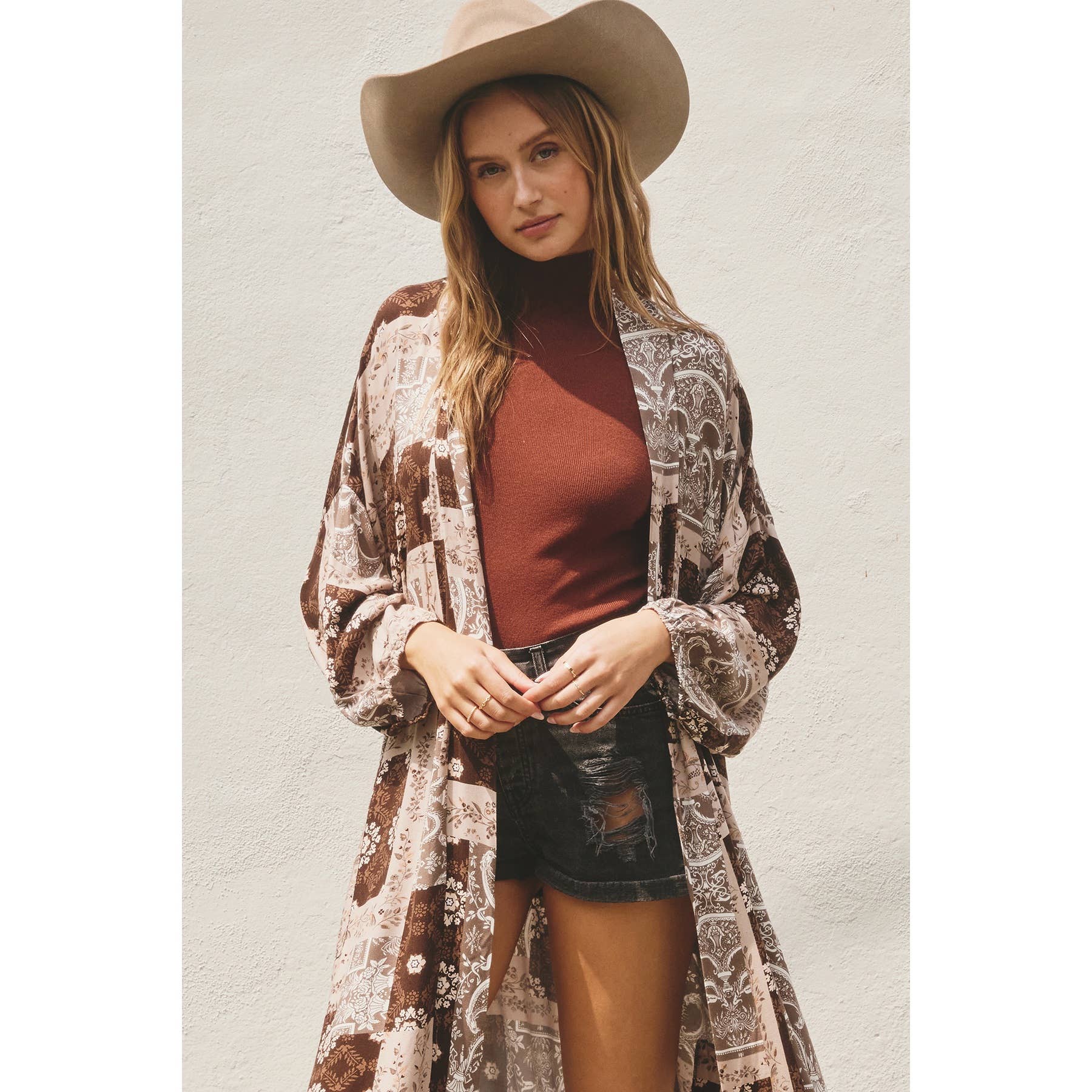 This is a long kimono duster with bubble sleeves with elastic openings, front patch pockets, and a sash belt. For colder weather, this can be styled with tall boots and felt hats to achieve the boho vibe. Model is 5'10" and wearing size Small.