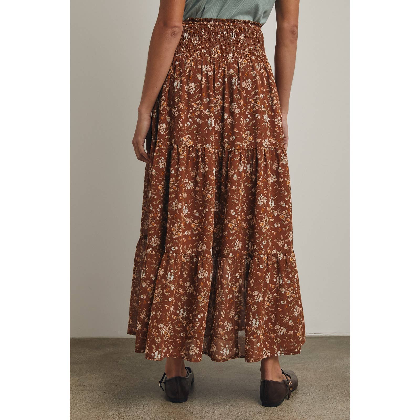 Romantic floral midi skirt with tiered layers and a breezy silhouette for an elegant touch.