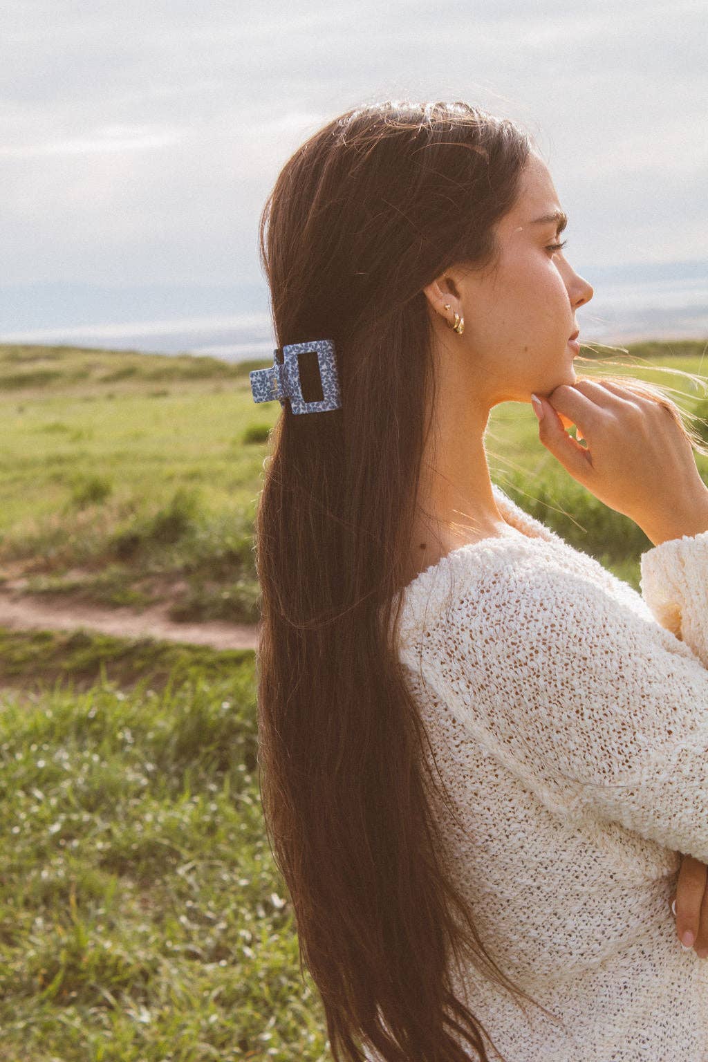 This small rectangle claw clip is so perfect and festive for the 4th of July! It comes in the cutest blue floral pattern, as well as a pretty pearly transparent and made out of a high quality acetate material. The best way to elevate your updo for the day. This is a small 2 inch claw clip.