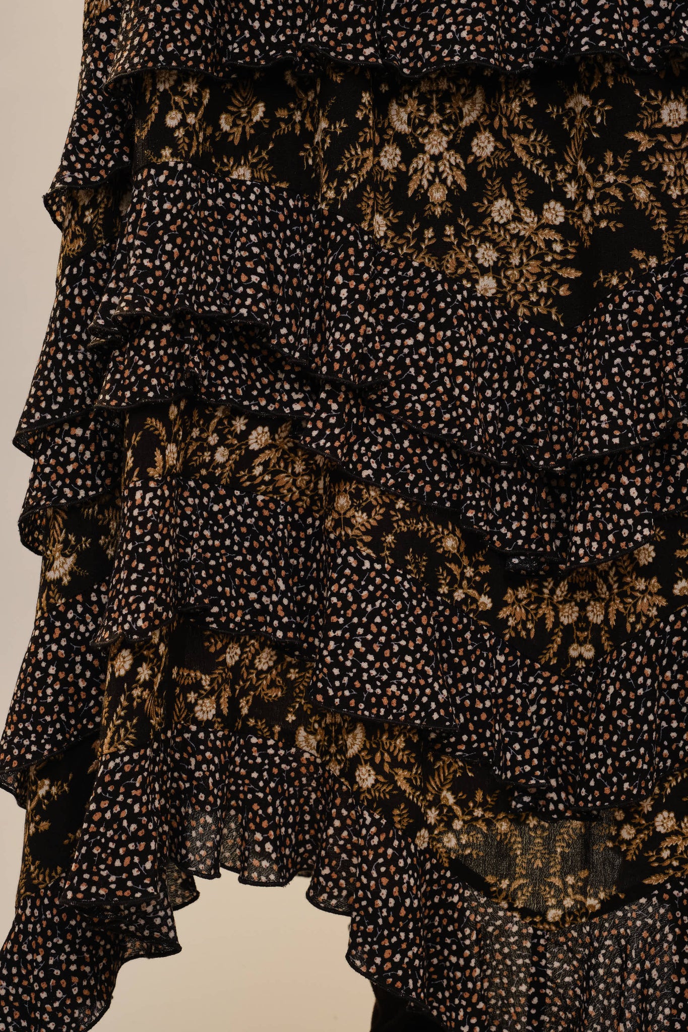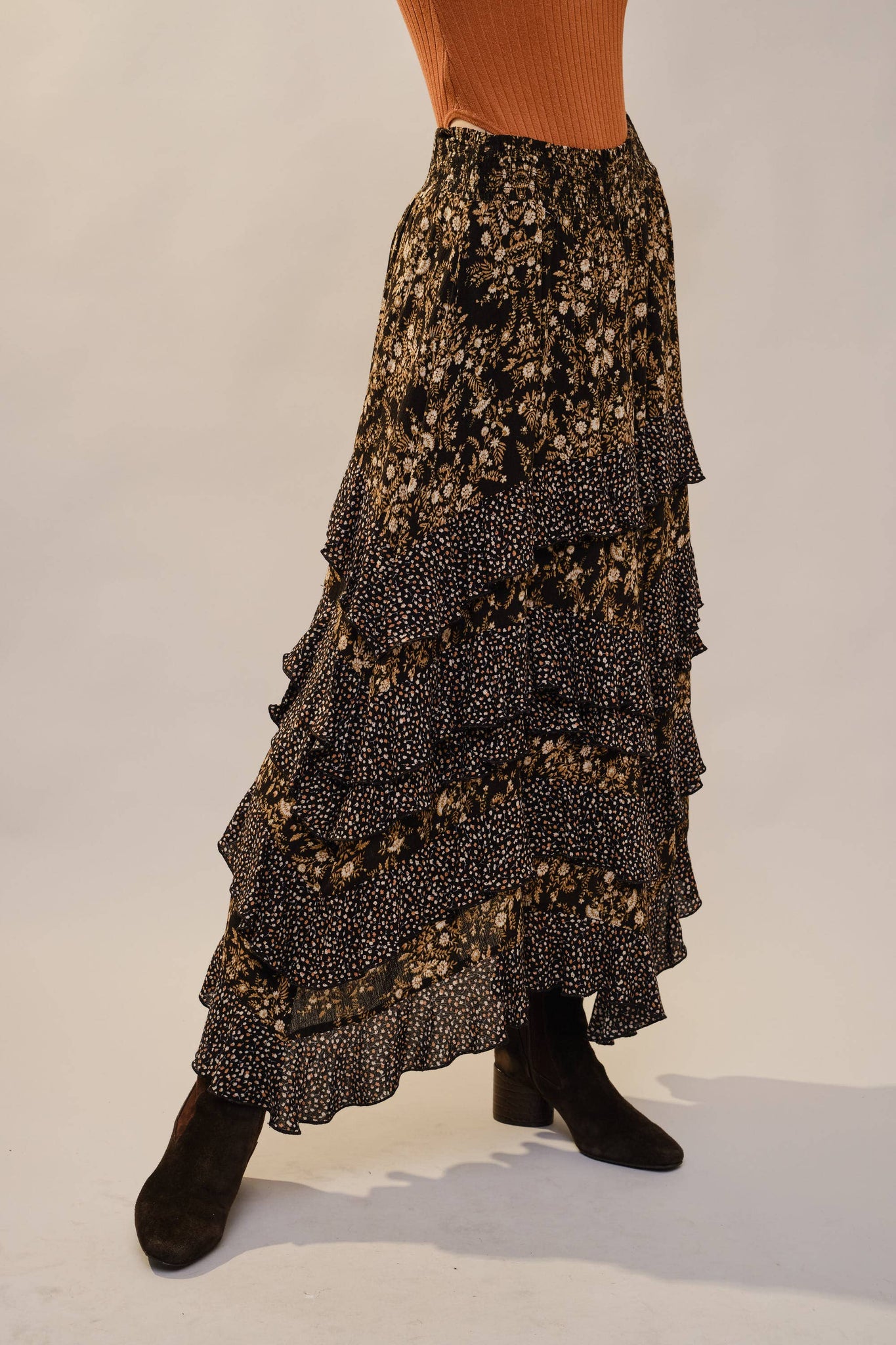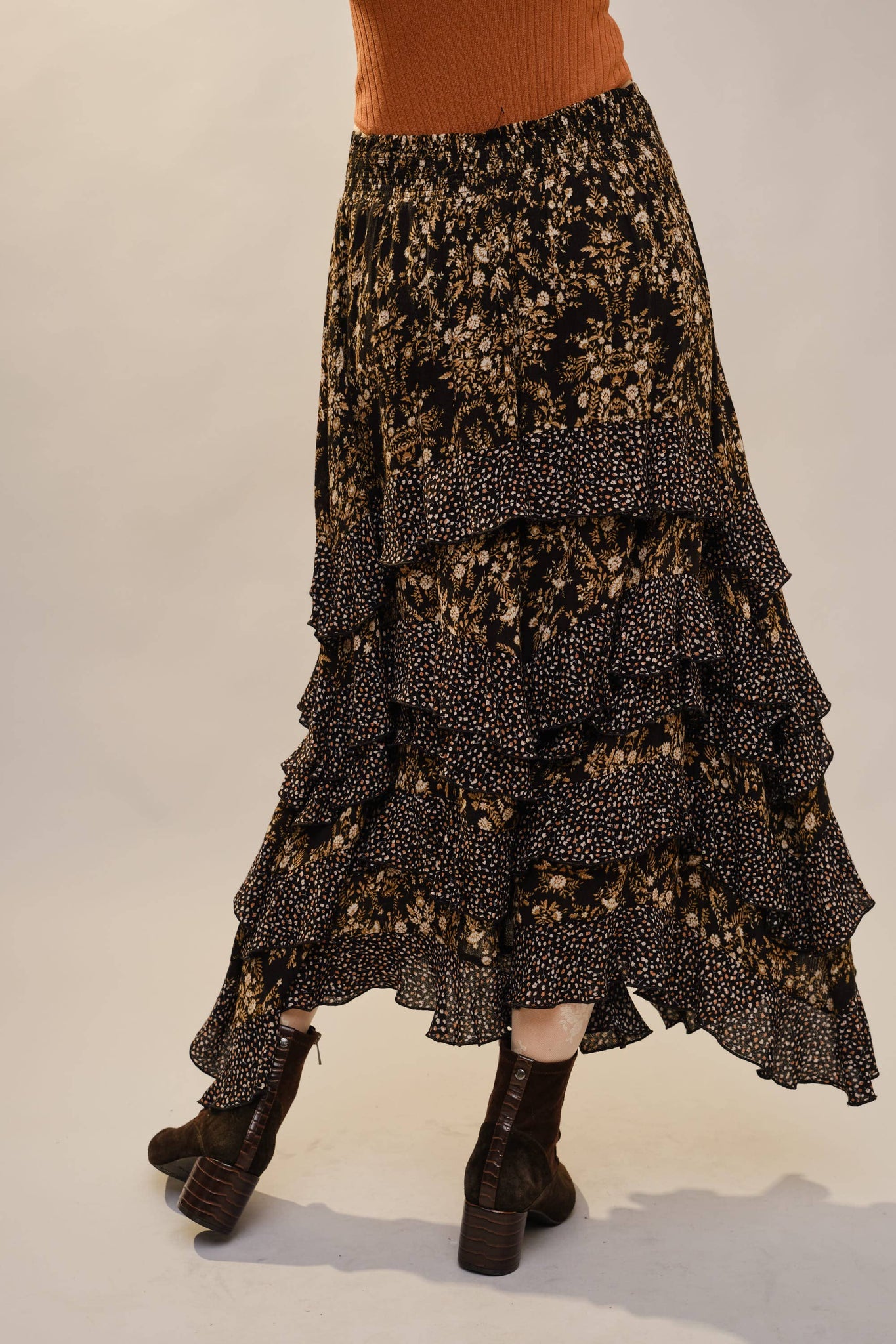 A flowy tiered maxi skirt featuring alternating floral and ditsy prints for a bohemian look. Designed with multiple cascading ruffle layers and an elastic waistband for comfort and movement.
